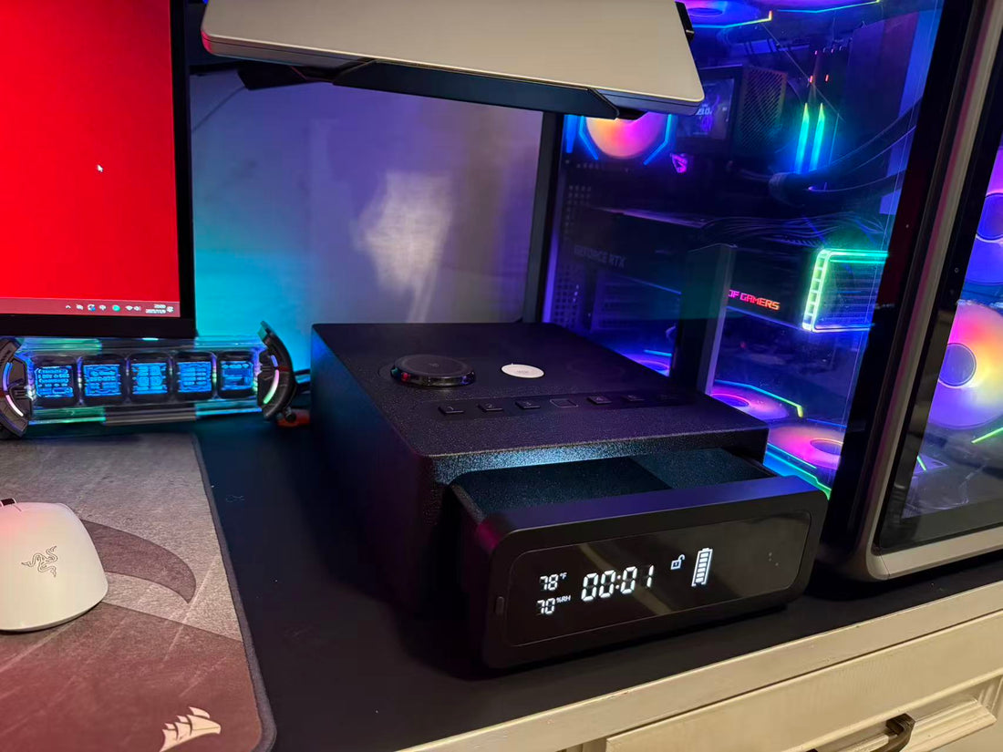 Biometric intelligent gun safe with wireless charging function for mobile phones and watches, 3 quick-access shelves, and fingerprint-lit keyboard - Compact bedside drawer safe with LED lights and 24-hour digital clock handgun safe